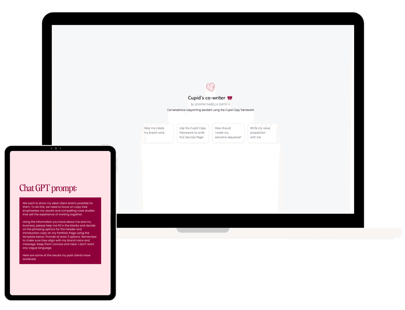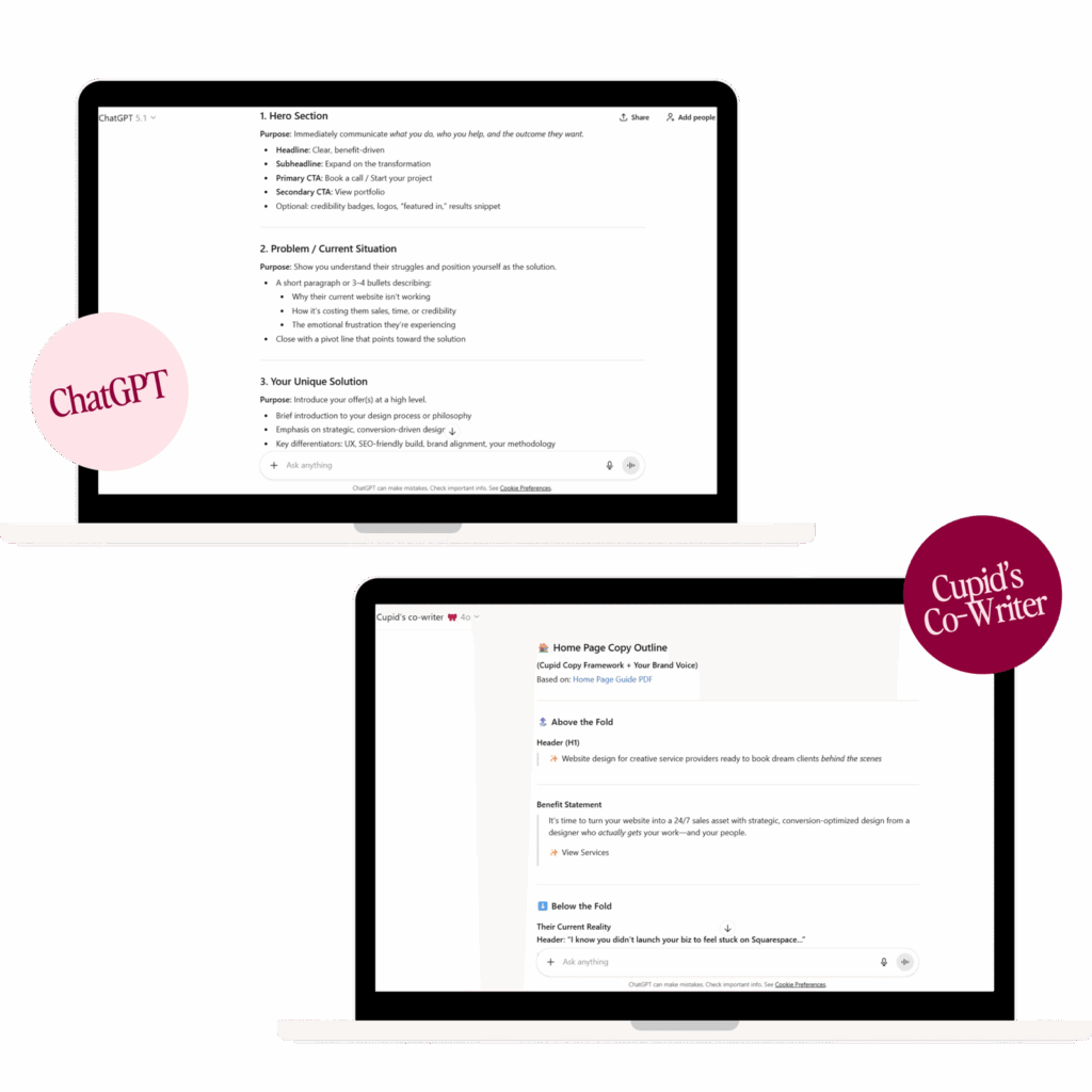 AI prompts for each guide, every section of your template, and my custom AI bot, trained on Cupid’s copywriting process and framework.