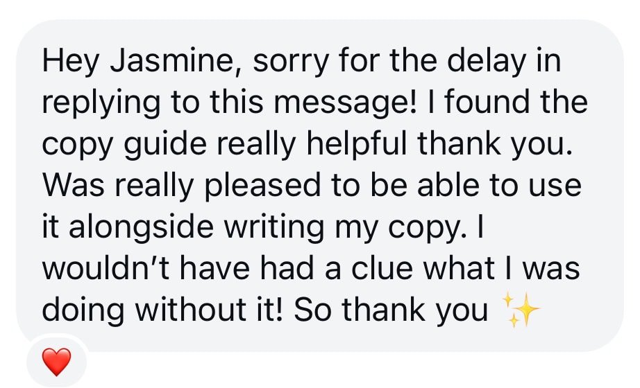 “This guide was and is a DREAM! It made writing my website copy SO easy & I still go back to it when I’m updating any of services or parts of my website. It massively reduced the time it would have taken me & is really easy to adapt and make fit my voice. Would definitely recommend!!”